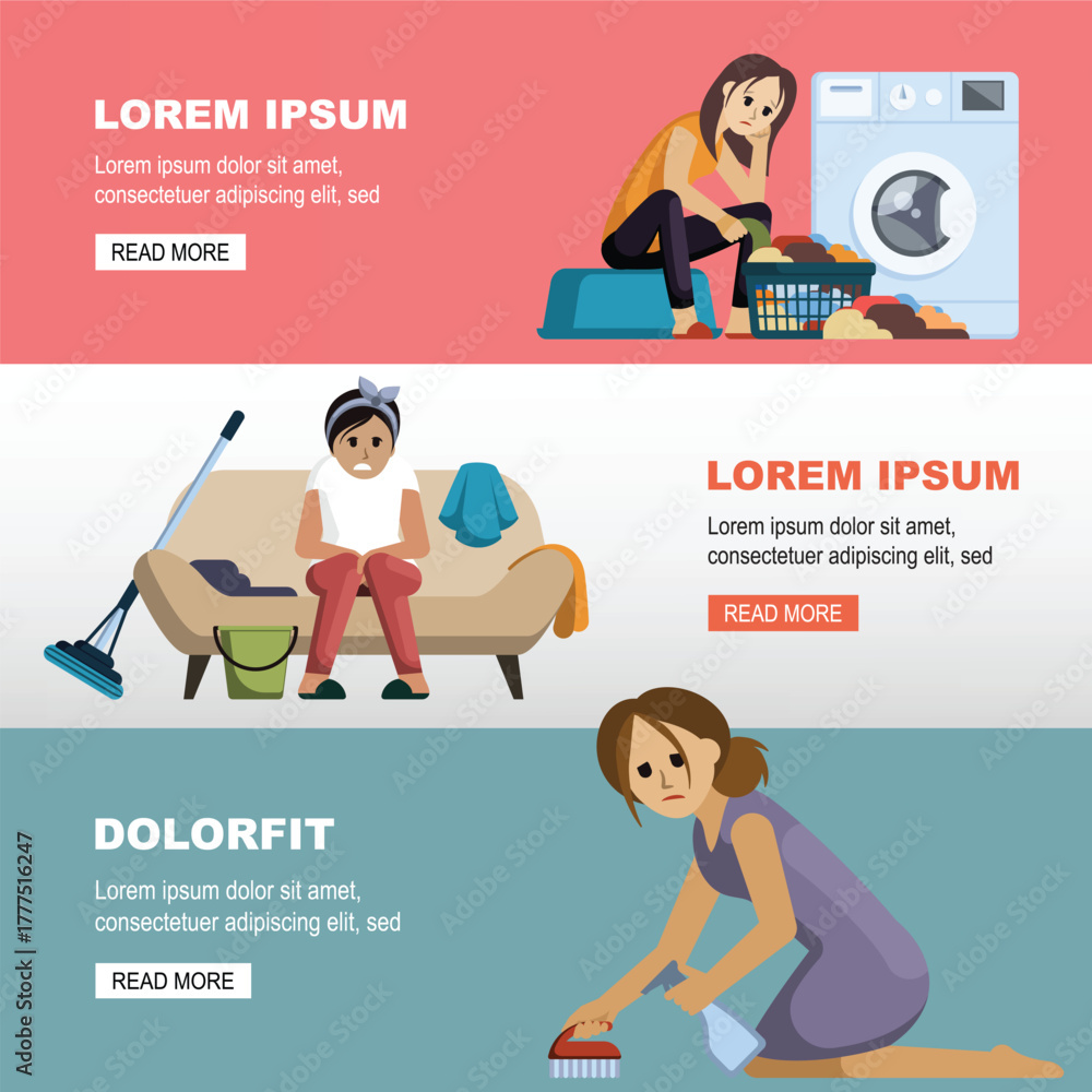tired household woman. household activities, washing, cleaning, make laundry, cooking, baking, shopping, irons, sorting garbage. vector cartoon horizontal banners. #1777516247