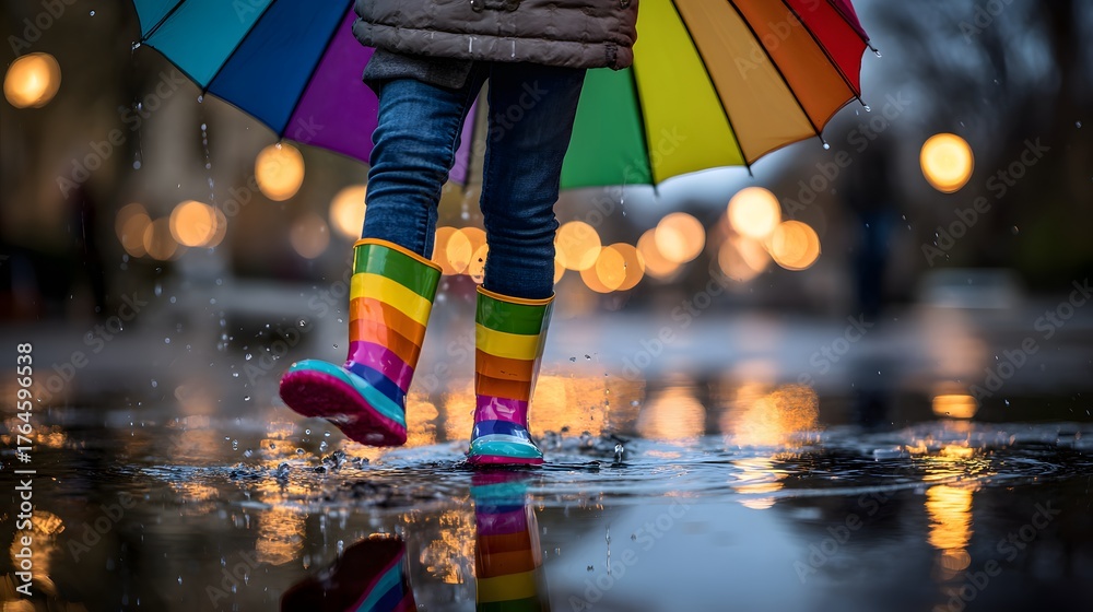 Titel: Kind mit Regenbogenstiefeln und Regenschirm läuft durch nasse Straße #1764596538