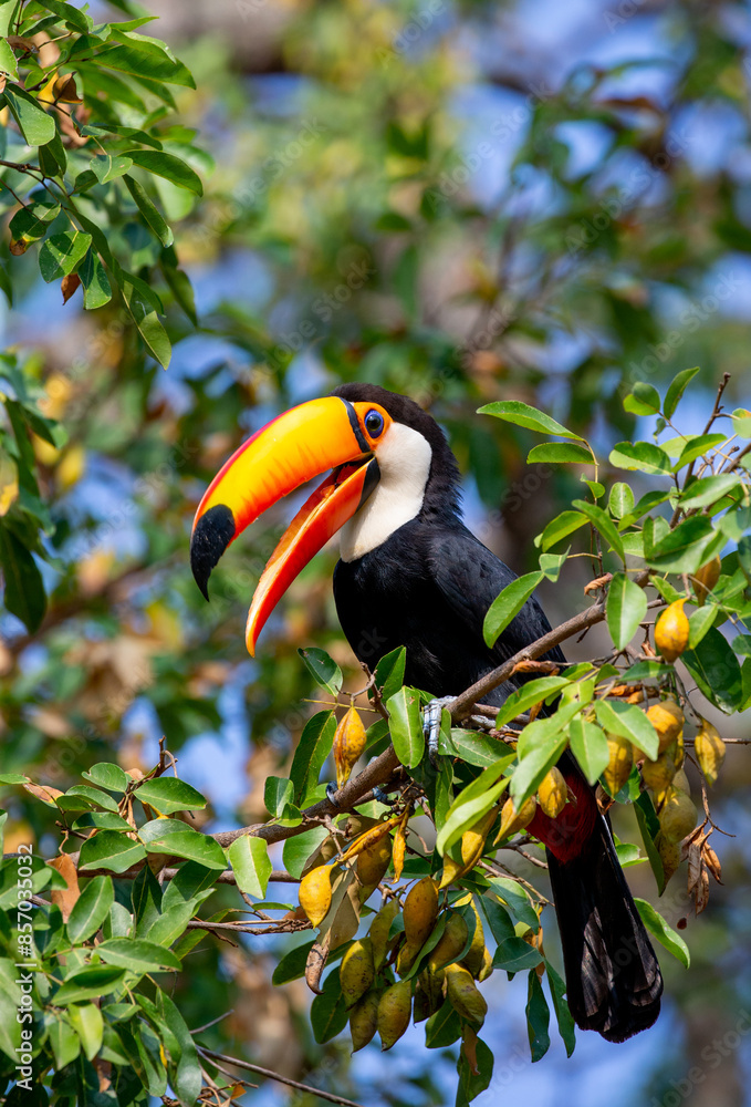Toco toucan (Ramphastos toco) is sitting on a tree branch. Brazil. Pantanal. #857035032