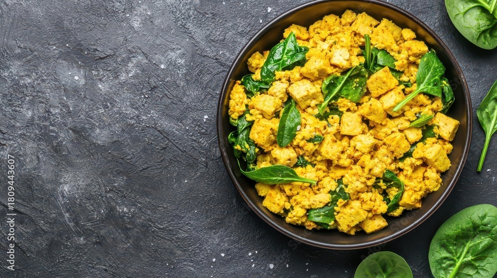 Tofu scramble with turmeric, spinach and sourdough toast, plantbased eating, proteinrich breakfast idea #1809443607