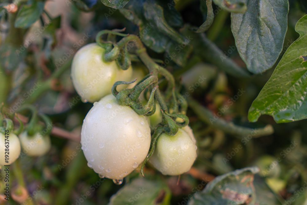 Tomato plant with green and red tomatoes growing naturally, showing different stages of ripening in the garden. #1928637478