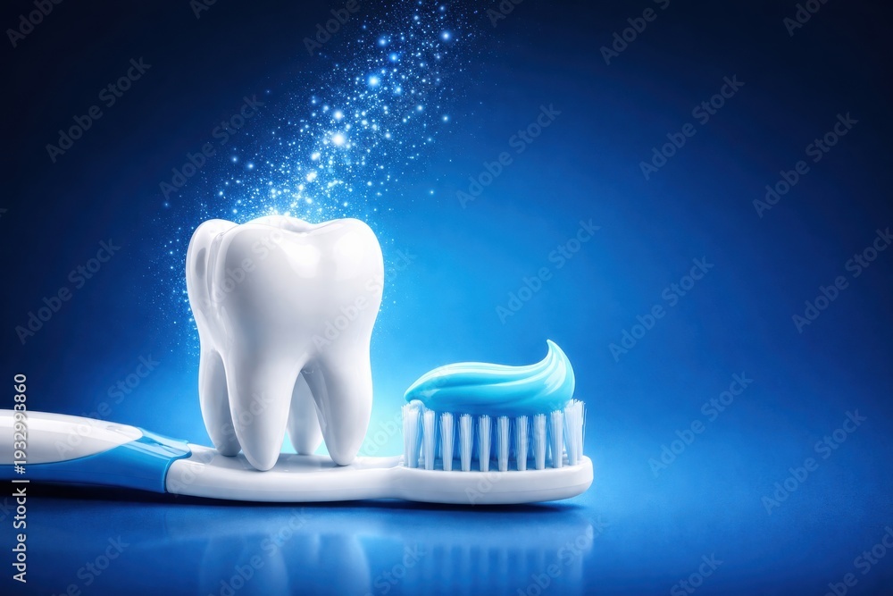 Toothbrush with toothpaste and sparkling tooth on blue background dental care and hygiene #1932993860