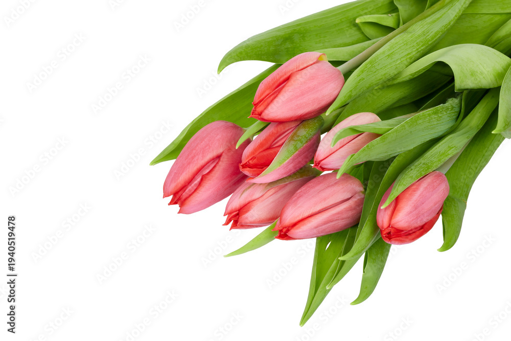 top corner of red tulips with stem and leaves as bouquet isolated on white or transparent png #1940519478