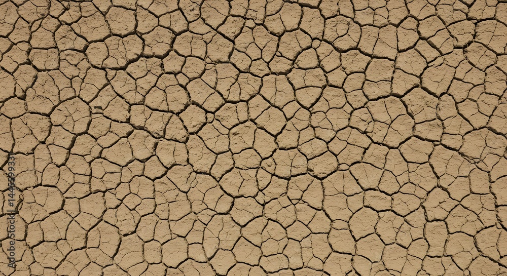Top-down view of cracked dry soil showing natural earth texture and color, suitable for environmental themes. #1445599331