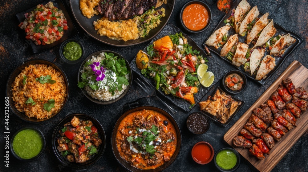 Top view Mexican food spread with multiple dishes on dark background, colorful and festive cuisine #1442723650