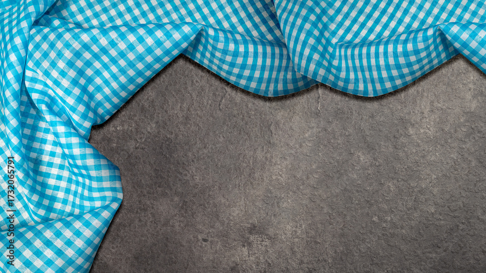 Top view of a blue checkered tablecloth or napkin with a black wall background. Copy space. Concept of Oktoberfest. Bavarian German culture festival decoration symbol #1732065791