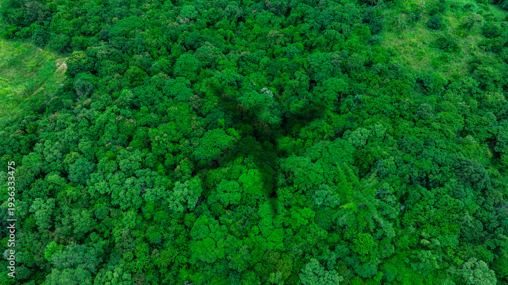 Top view of a large airplane shadow gliding over a lush green tropical rainforest canopy, symbolizing air travel, adventure, and flight transit over nature. concept nature travel #1936333475