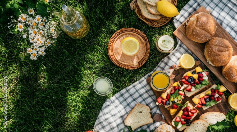 Top view of a summer picnic spread with sandwiches, fruit skewers, lemonade, and cloth napkins on grass #1527518270