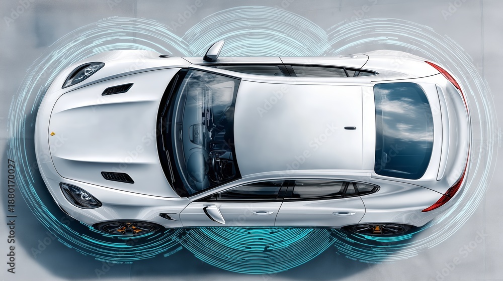 Top view of autonomous car with sensor radar visualization symbolizing advanced driver assistance intelligent navigation and future focused vehicle safety systems #1880170027