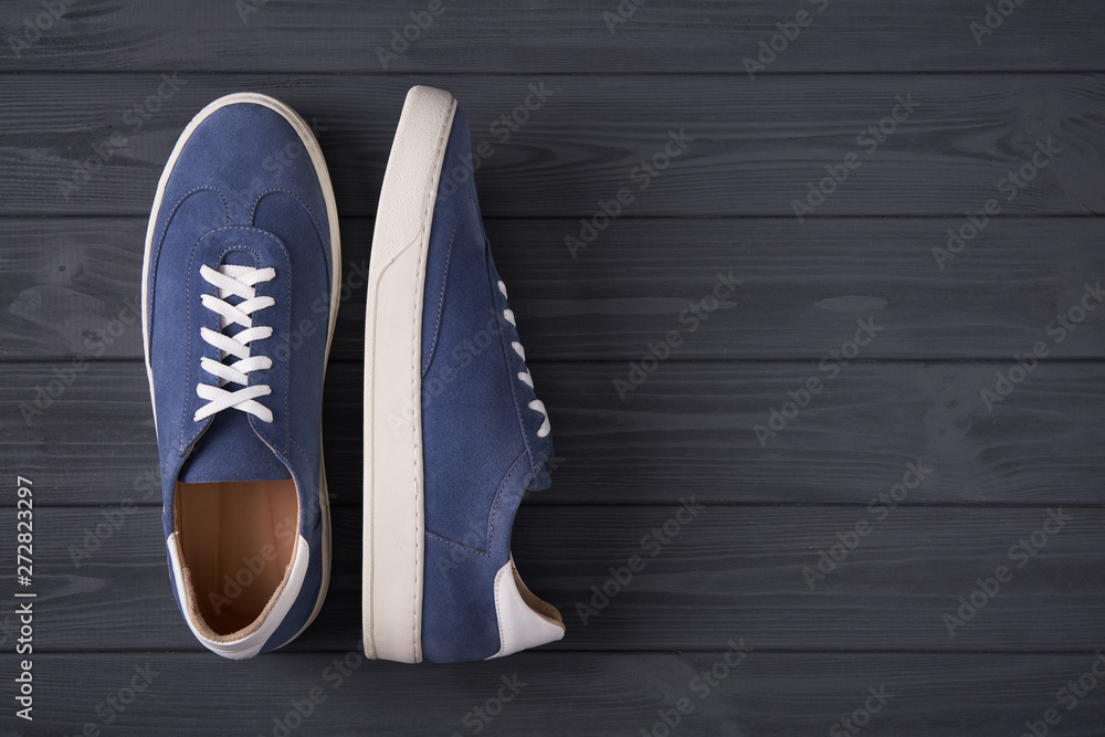 Top view of casual blue suede trainers on grey wooden planks #272823297
