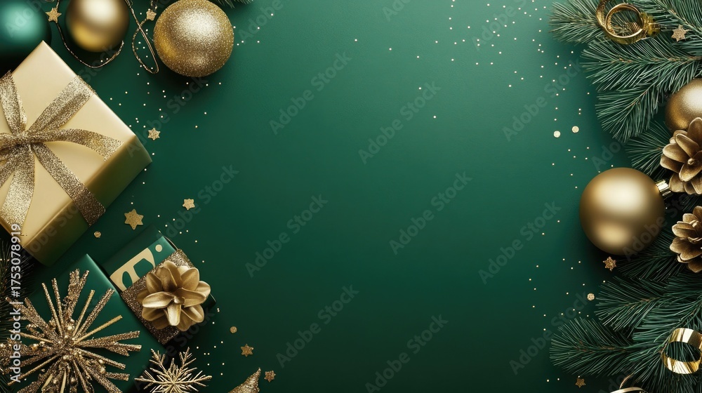 Top view of Christmas decorations with gifts, candy canes, and ornaments on a green background creating a festive holiday atmosphere. High quality photo #1753078919