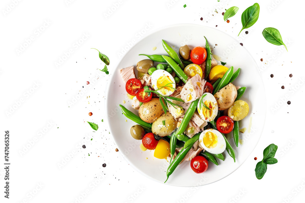 top view of French salad Nicoise with boiled potatoes, green beans, cherry tomatoes, hard-boiled eggs, tuna, olives and anchovies, dressed with vinaigrette. #747065326