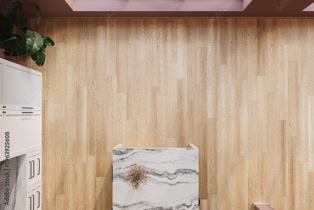 Top view of modern kitchen island with wooden floor, 3D render #1963925608
