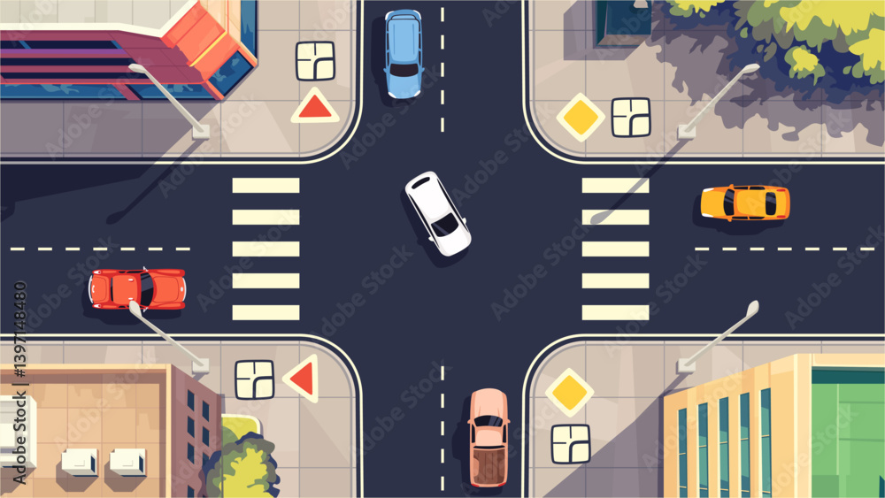 Top view of road intersection with cars and road signs. View from above. Traffic rules. Driving school test. City street with buildings, pedestrian crossing, crossroad. Vector illustration. Flat style #1397148480