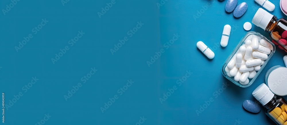 Top view of various medicines for flu illnesses cold and cough displayed on a blue table with tablets Ample space for a copy space image #814543959