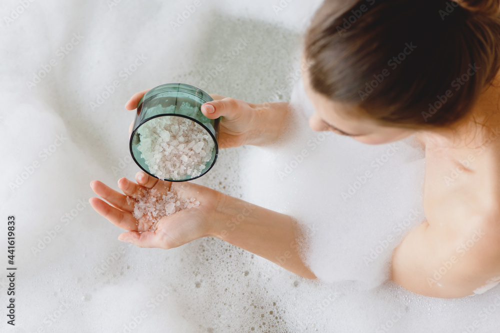 Top view of woman sitting in foam bath with sea bath salt in hands. #441619833