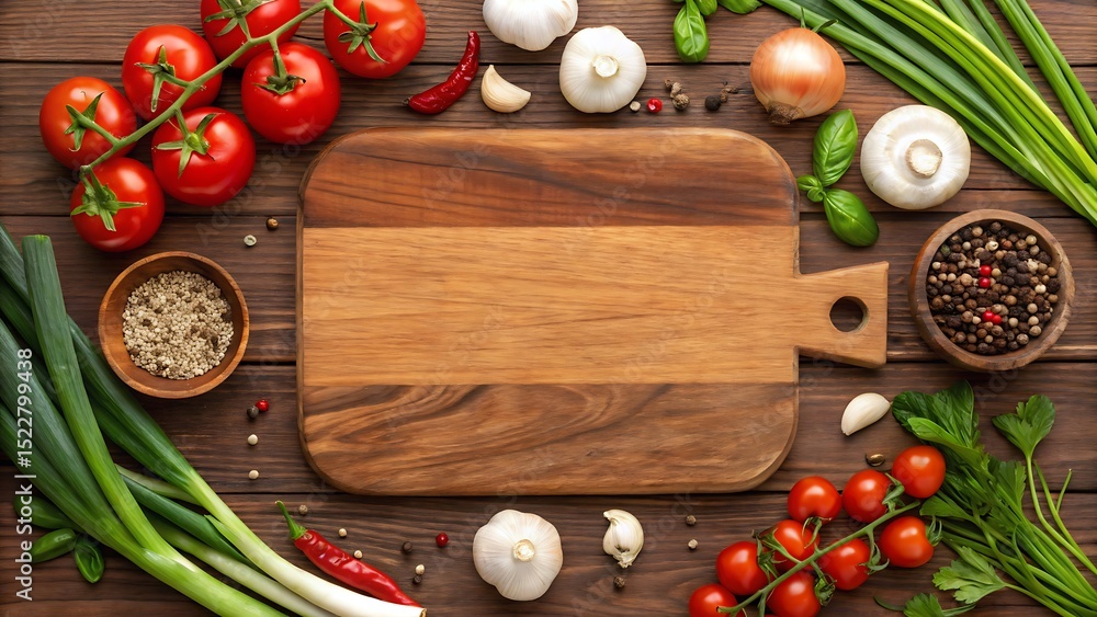 Top View of Wooden Cutting Board Surrounded by Fresh Vegetables and Spices on Rustic Kitchen Table #1522799438