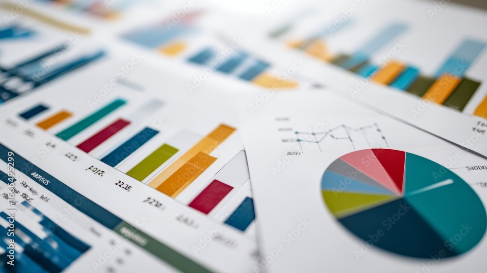 Topdown macro closeup of colorful business charts and data visualizations with structured statistical graphs and copy space for modern analytical reports #1666495299