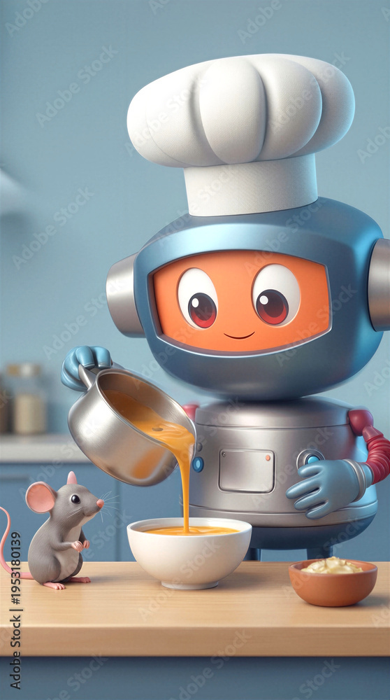 Toque-wearing machine pouring orange soup into bowl for small mouse. Innovative cooking assistant preparing meal in modern kitchen. #1953180139