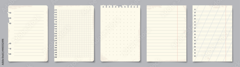 Torn paper sheets from notepad. Checkered or striped pages with texture. Design elements for poster and print. Notepaper for reminders. Realistic vector illustration collection #1443552498