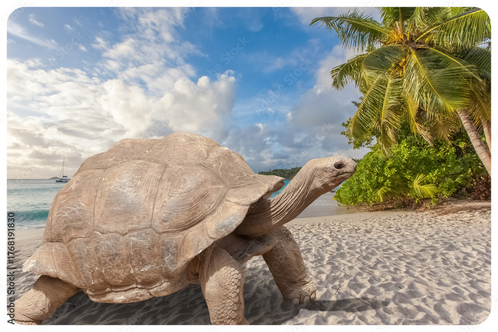 Tortue des Seychelles sur plage de Praslin #1768191830