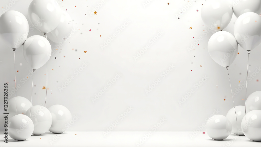 Total white festive empty room mockup scene with a blank space for text, minimalistic party style with white balloons and golden confetti, elegant Surprise holiday concept, studio light #1227028363