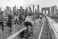 Tourists in New York on Brooklyn bridge with Manhattan skyscrapers on background #313598173