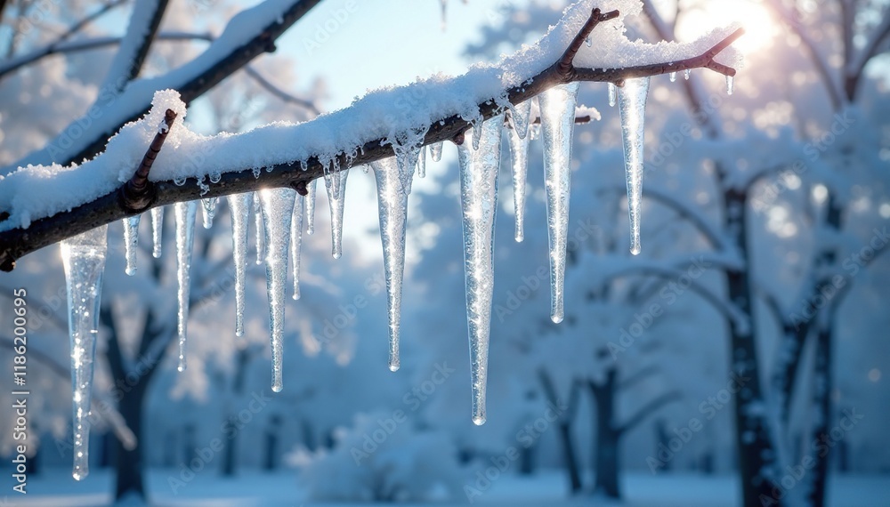 Towering icicles hanging from frozen branches on a winter tree, icicle, frosty #1186200695