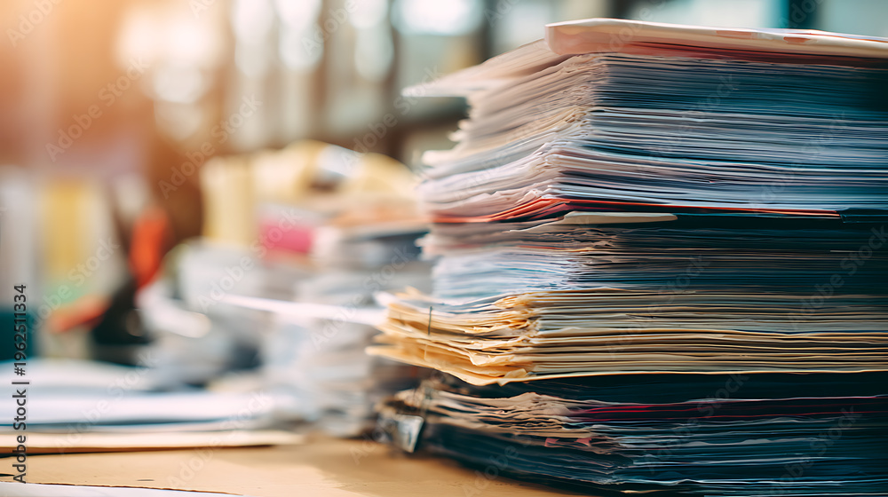 Towering stack of messy documents and paperwork on a desk in an office setting, highlighting organization challenge and workload chaos #1962511334