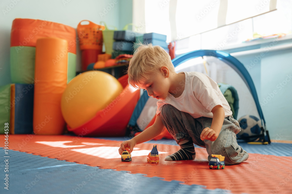 Toy cars, playing with them. Cute preschool child, boy, during developmental activities in a playroom #1910464538