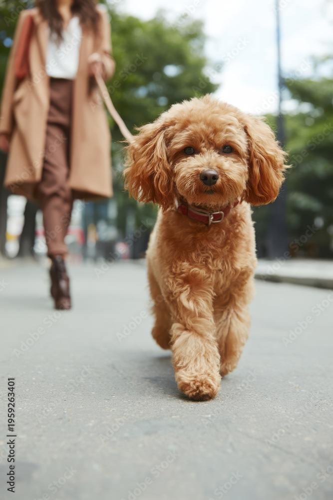 Toy poodle dog walking on a city street with an owner, enjoying an urban stroll and daily outdoor exercise #1959263401