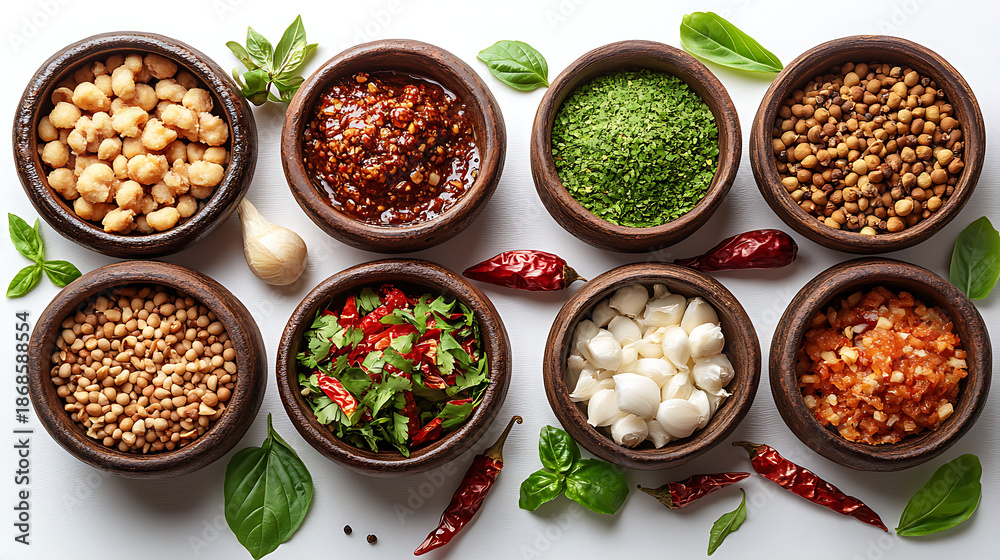 Traditional clay mortar and pestle with Thai chili relish ingredients arranged artfully on white background #1868588554
