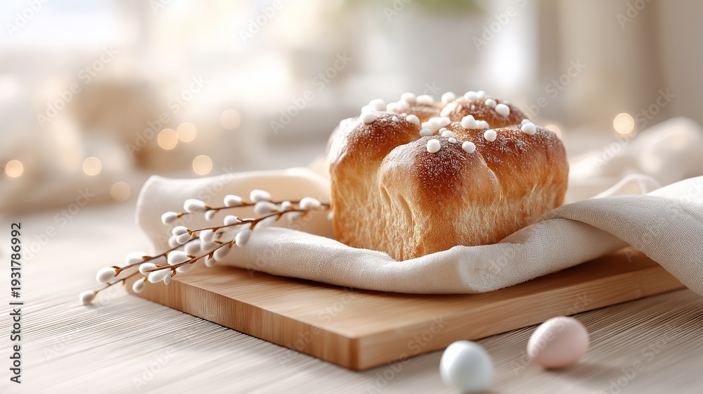 Traditional Easter sweet bread with sugar topping placed on wooden board with willow branches and pastel eggs. Seasonal bakery concept for holiday marketing and food branding #1931786992