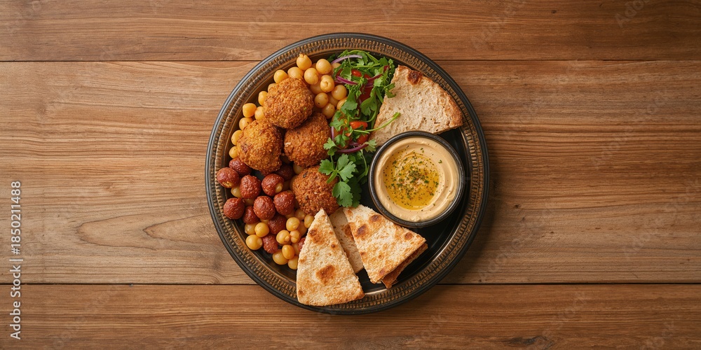 Traditional homemade hummus, falafel and chickpeas with salad and pita on wooden table, highlighting plant-based meal preparation #1850211488