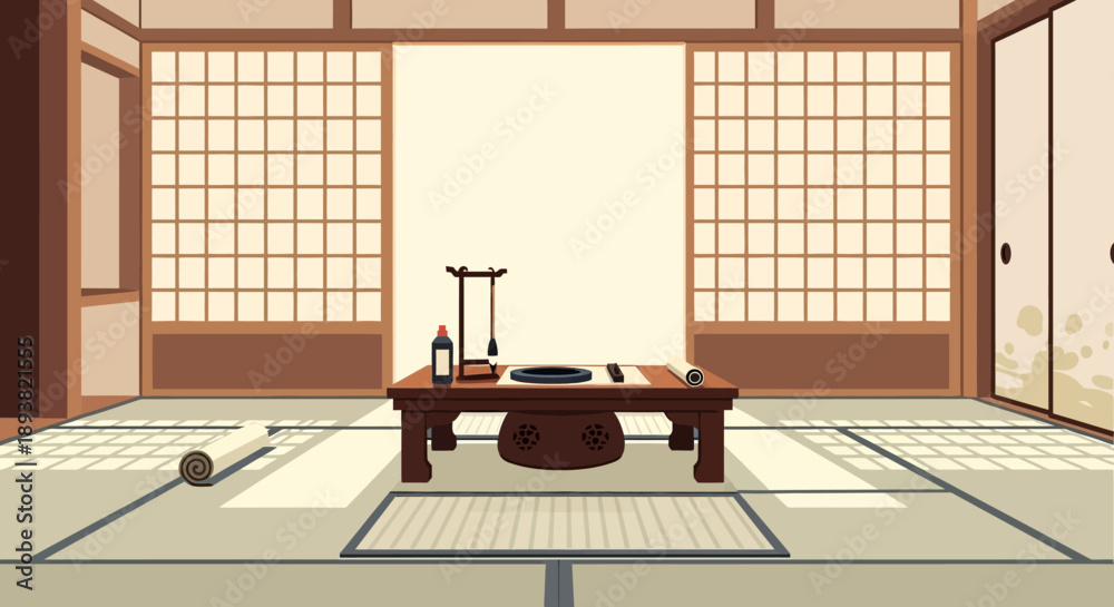 Traditional Japanese tatami room with a low table for tea ceremony inside a shoji-paneled dwelling. #1893821555
