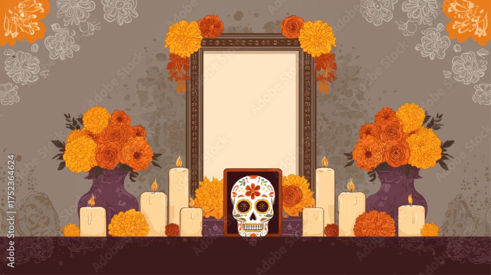 Traditional ofrenda altar with candles, marigold flowers, and sugar skulls for Day of the Dead, Mexican remembrance celebration vector. #1752364624