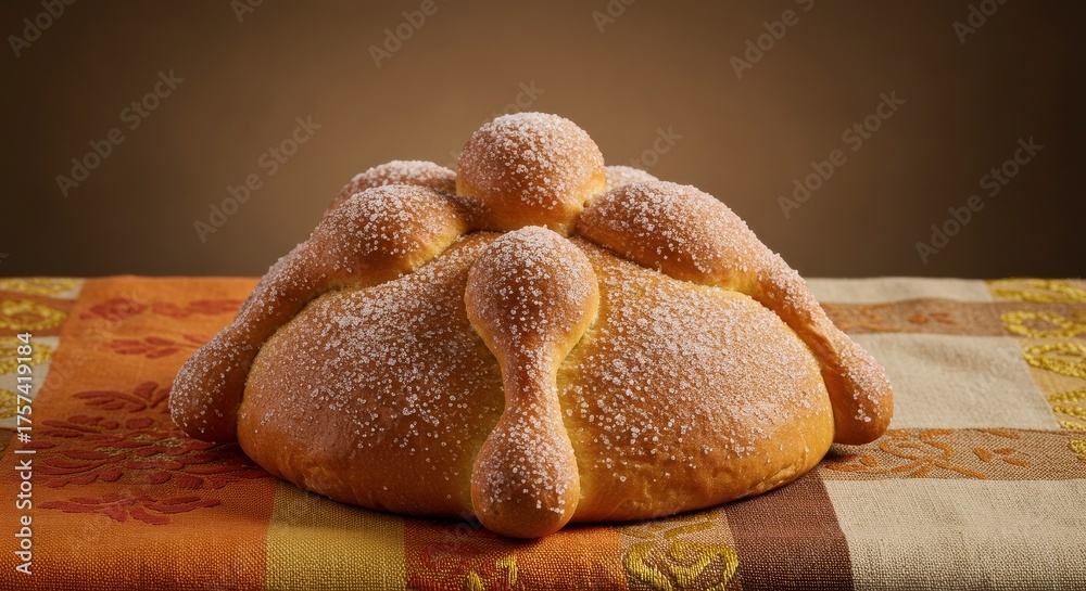 Traditional pan de muerto for day of the dead celebration on decorative tablecloth #1757419184