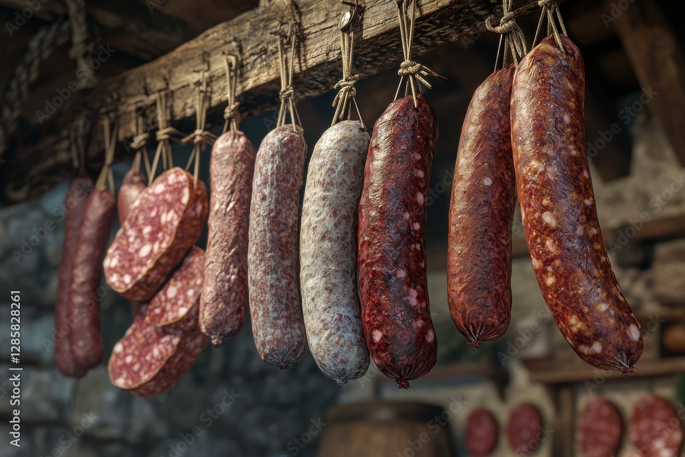 Traditional smoked sausages hanging, featuring cured meats, displaying artisanal food and rich textures, ideal for illustrating culinary and gourmet food concepts and themes. #1285828261