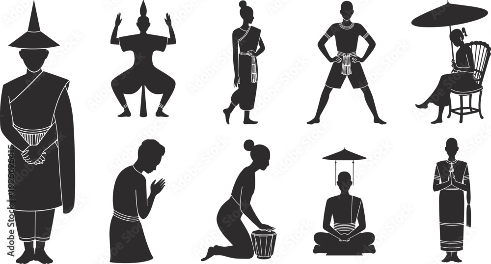 Traditional Southeast Asian silhouettes, cultural attire, ceremonial dance, meditation, prayer, greeting, umbrella, heritage, spirituality #1925625415