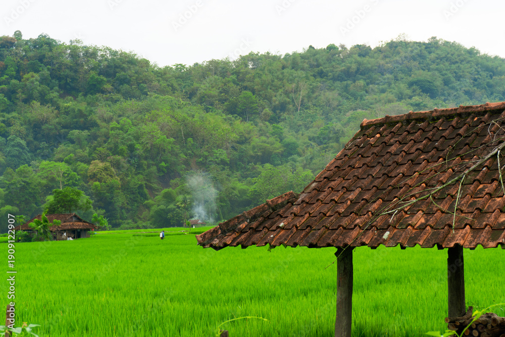 Traditional terracotta roofed house beside vibrant green rice paddies stretching to a forested hill, smoke rising from a distant hut in a serene rural Southeast Asian landscape #1909122907