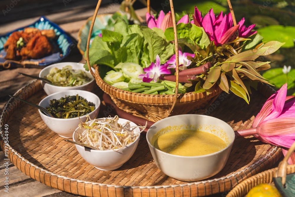 Traditional Thai food set with fresh organic vegetables and lotus flowers for healthy lifestyle and cultural dining #1973544949