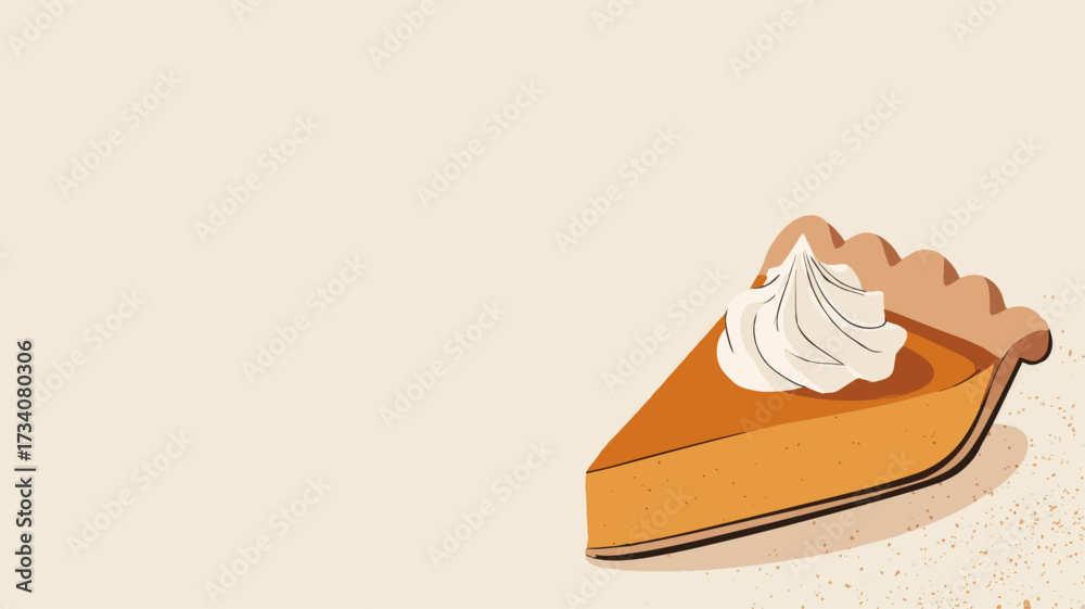 Traditional thanksgiving pumpkin pie slice with whipped cream topping on rustic background, cozy holiday dessert vector illustration. #1734080306