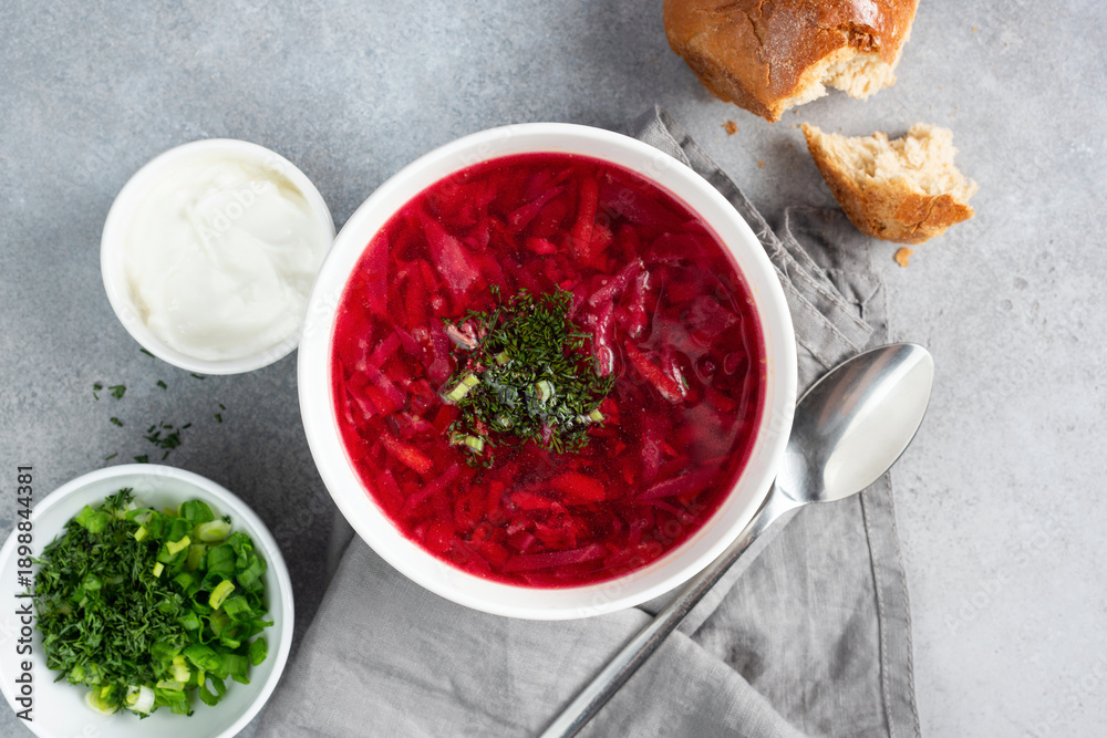Traditional Ukrainian Borscht with cabbage and beet. Comfort and warming healthy vegetable soup in white bowl #1898844381