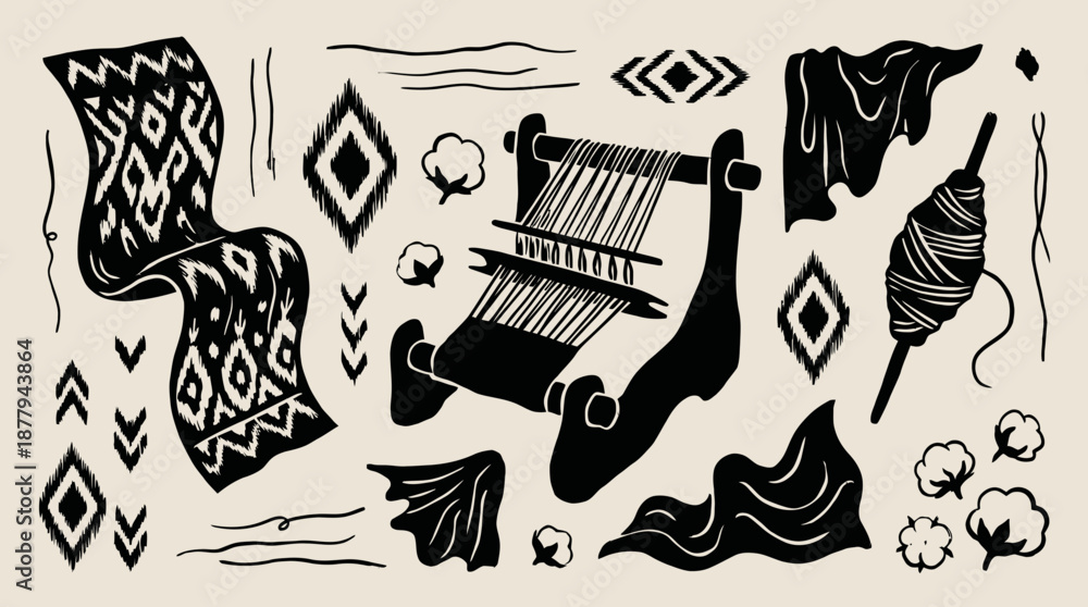 Traditional weaving loom and ikat textile patterns vector illustration #1877943864