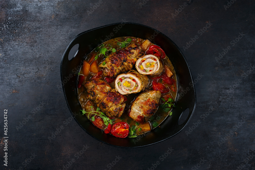 Traditionelle slow cooked deutsche Schweinerouladen mit Gemüse und Speck in würziger Bratensoße als Draufsicht in einem Design Topf #625634742