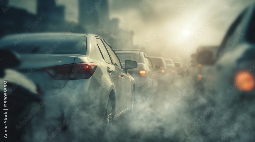 Traffic congestion in an urban area with cars emitting heavy exhaust pollution during a foggy or smoggy day. #1590535951