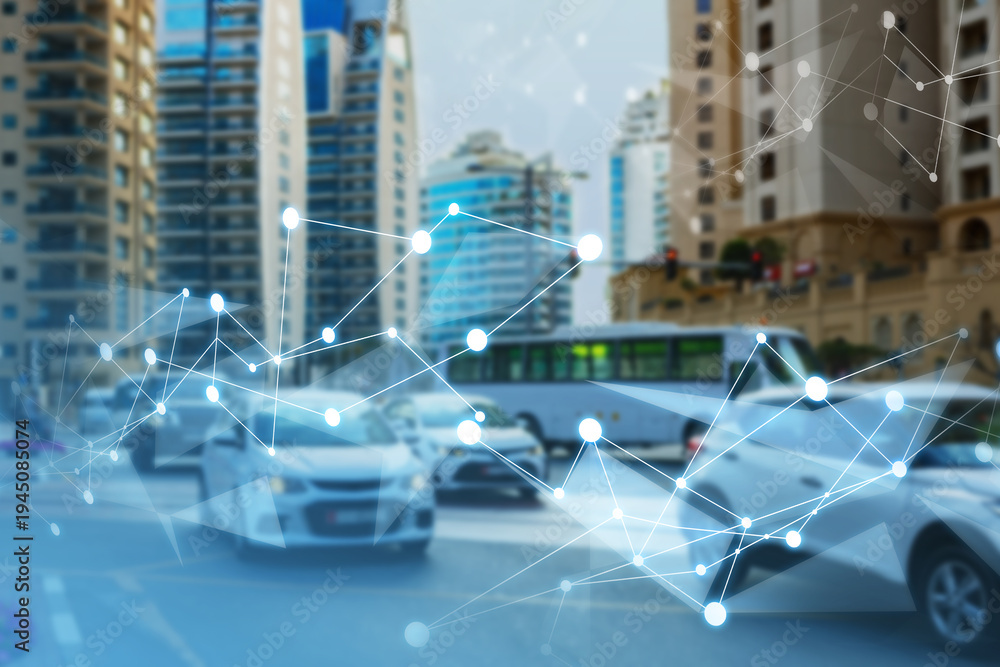 Traffic moves through a city with buildings in the background and data lines overlay #1945085074