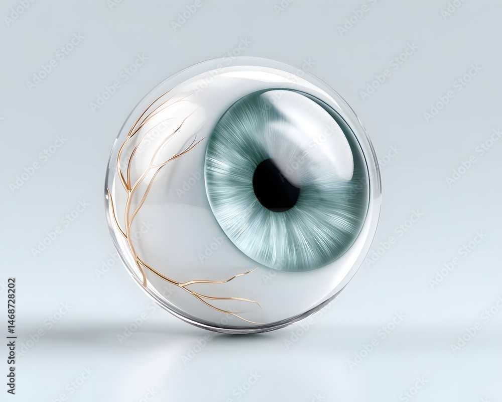 Transparent 3D eye globe with clear sinus and optic nerve pathways, ultra-detailed lighting on smooth glass surface, no watermark or base, high-definition medical artistry, with ample copyspace #1468728202