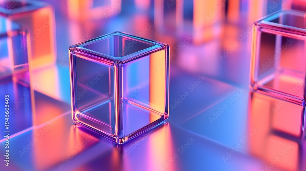 Transparent glass cubes on a reflective surface with vibrant neon lighting in a futuristic scene #1946663405