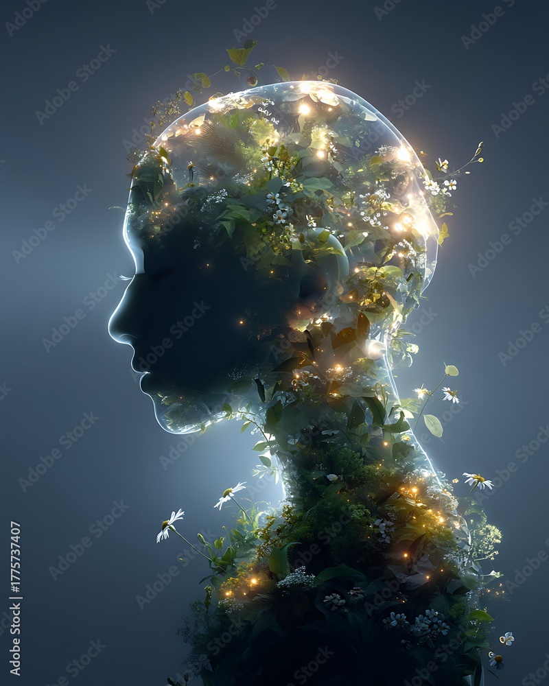 transparent human silhouette filled with glowing plants and flowers growing inside the brain, concept of healing and positive growth, ethereal lighting, #1775737407